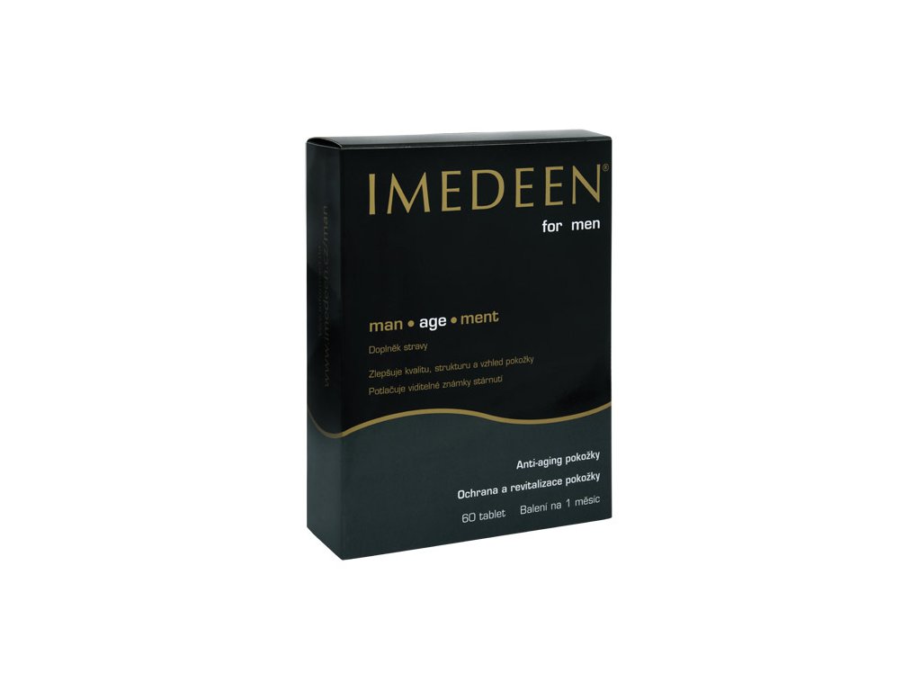 Imedeen man-age-ment představuje snadný a účinný způsob péče o pokožku celého těla pro muže ve formě tablet. Působí uvnitř kůže v hlubší vrstvě dermis, tzn. v místě, kde začíná proces stárnutí kůže, později viditelný i na pokožce. S věkem se kůže postupně ztenčuje a pokožka je tak náchylnější k opotřebení a citlivější na vlivy okolního prostředí. Denní holení navíc poškozuje ochrannou bariéru kůže. Imedeen man-age-ment působí na pokožku jako antioxidant, hydratuje ji, vyživuje, revitalizuje a zlepšuje tak vnější vzhled. Navíc ji chrání před UV zářením a škodlivými vnějšími vlivy.