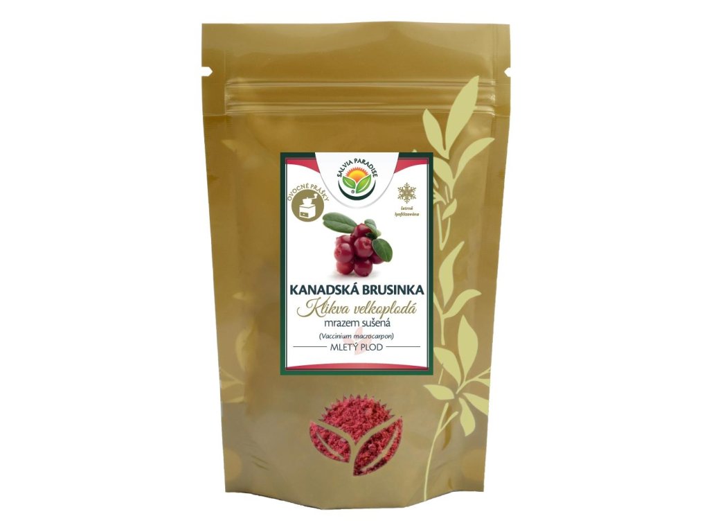 Kanadská brusinka mletá od Salvia Paradise® je sušena mrazem. Vakuové vymrazování neboli lyofilizace je nejšetrnější způsob zpracování ovoce. Lyofilizované ovoce si zachovává až 90 % obsahových látek, vitamíny, chuť i aroma čerstvého ovoce. Kanadská brusinka obsahuje tzv. proanthokyanidiny (PAC).