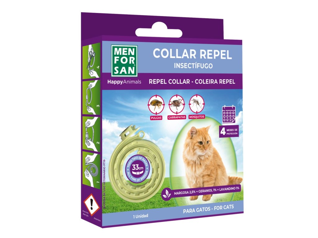 Přírodní obojek pro kočky proti hmyzu (blechy, vši, komáři a klíšťata). Obojek poskytuje repelentní ochranu po dobu 90 dnů a může být používán od prvního měsíce života kočky. Přírodní netoxické složení zaručuje vhodnost i pro koťata, březí kočky a zvířata alergická na běžné insekticidy.