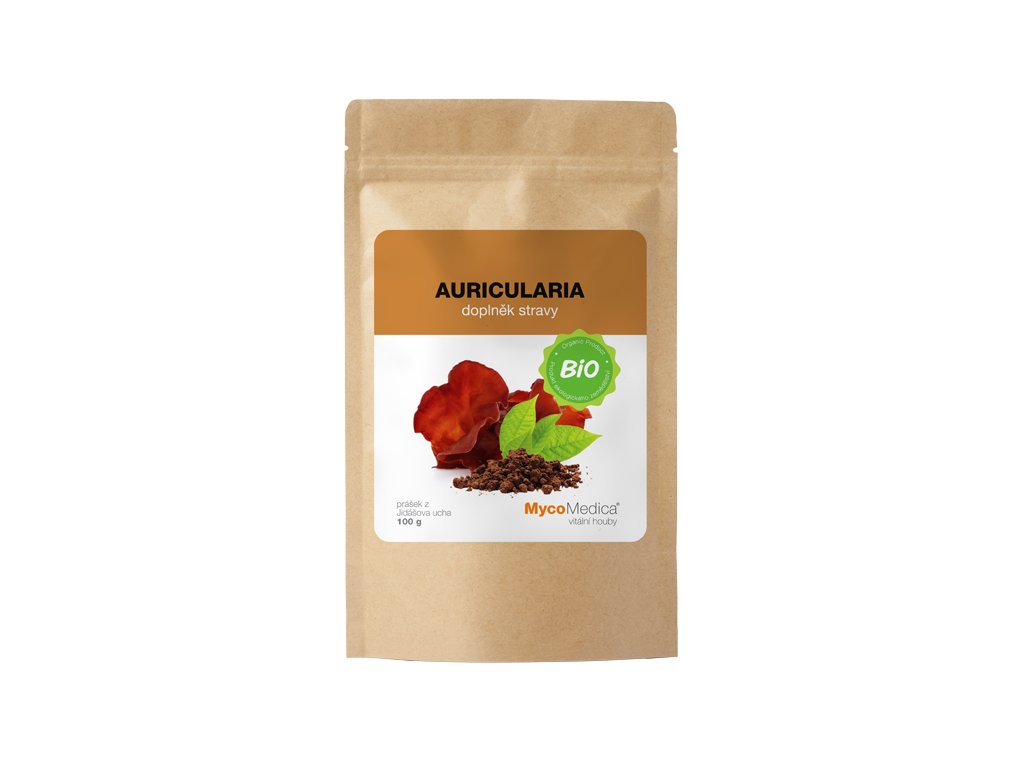 100% BIO Auricularia polytricha – prášek z plodnice; bez přídatných látek.