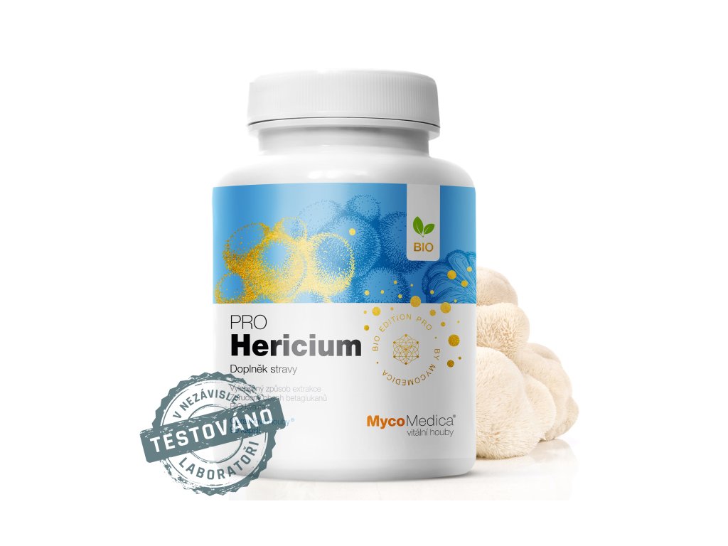 500 mg BIO Hericium (korálovec ježatý, Hericium erinaceus) – kombinovaná extrakce z plodnice, min. 30 % beta 1,3/1,6 D-glukanů (100% čistý extrakt).