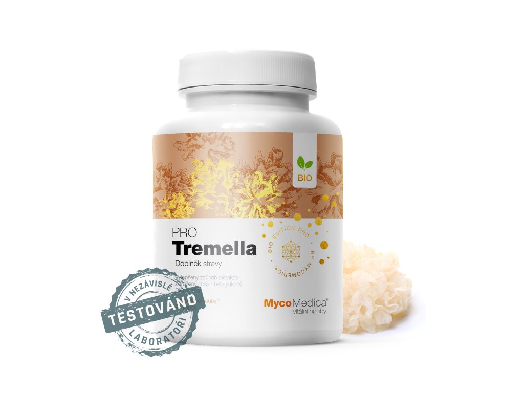 500 mg BIO Tremella (rosolovka řasotvará/stříbrná, Tremella fuciformis) – kombinovaná extrakce z plodnice, min. 30 % beta 1,3/1,6 D-glukanů (100% čistý extrakt).