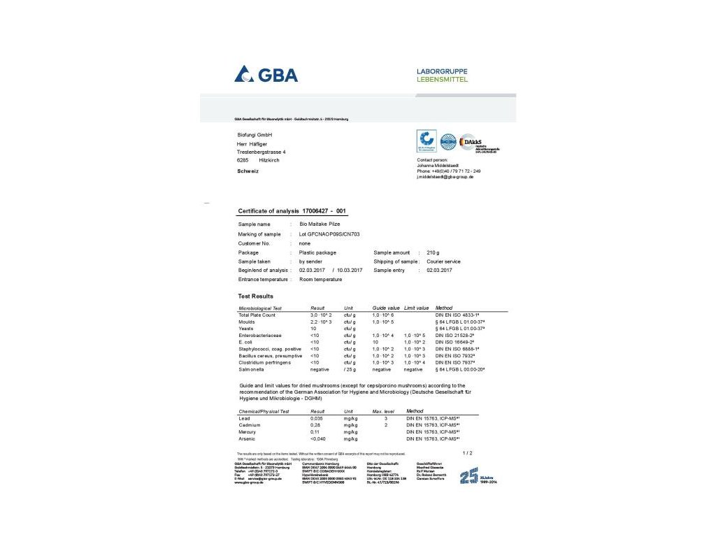 Všechny naše houby jsou testované v německé laboratoři na těžké kovy, pesticidy apod. Nejsou ozařovány a jsou sbírány ručně. Nabízíme medicinální houby té nejvyšší kvality z přísně kontrolovaného pěstování.