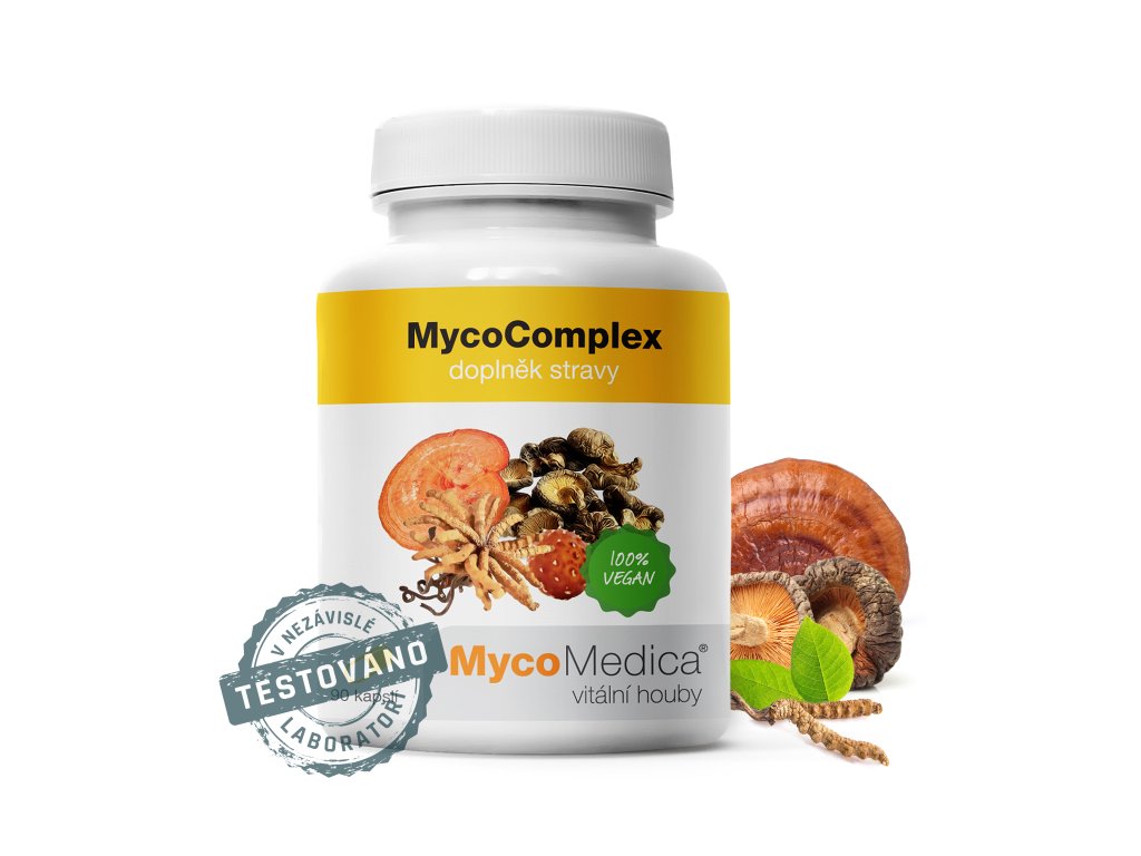 MycoComplex je vyvážená kombinace vitálních hub Cordyceps (housenice čínská, Cordycpes sinensis), Reishi (lesklokorka lesklá, Ganoderma lusidum), Agaricus (brazilský/mandlový žampion, Agaricus blazei Murill) a Shiitake (hoževnatec jedlý, Lentinula edodes). Je doplněná Acerolou (brazilská třešeň), která obsahuje vysokou koncentraci vitamínu C. Vytvořili jsme ji pro celkové doplnění sil a podporu přirozené obranyschopnosti a regulaci imunitního systému. Použité čtyři houby působí ve směsi synergicky, jejich účinek se tak násobí.