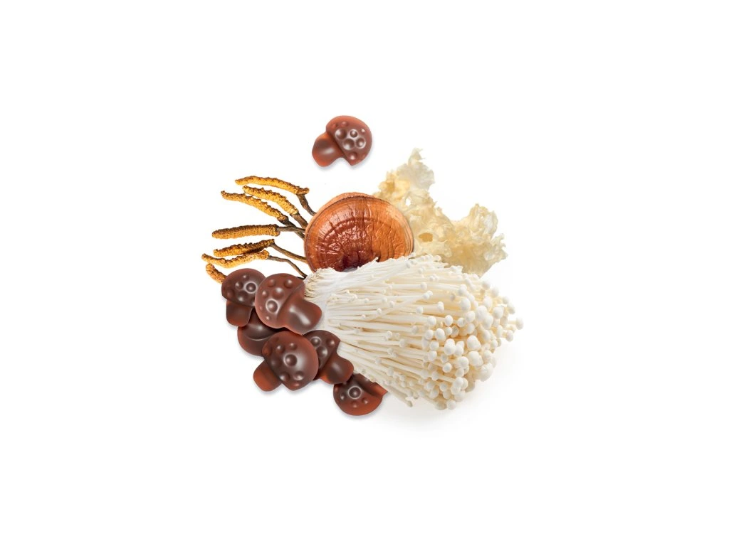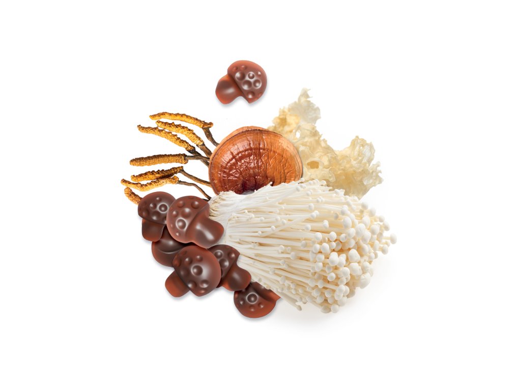V každé houbičce je zastoupeno 10 druhů hub (Chaga, Hericium, Cordyceps, Reishi, Enoki, Maitake, Shiitake, Agaricus, Tremella a Hlíva), každý po 25 mg. Celkový obsah houbových extraktů v jedné houbičce je 250 mg, což odpovídá zhruba polovině kapsle.