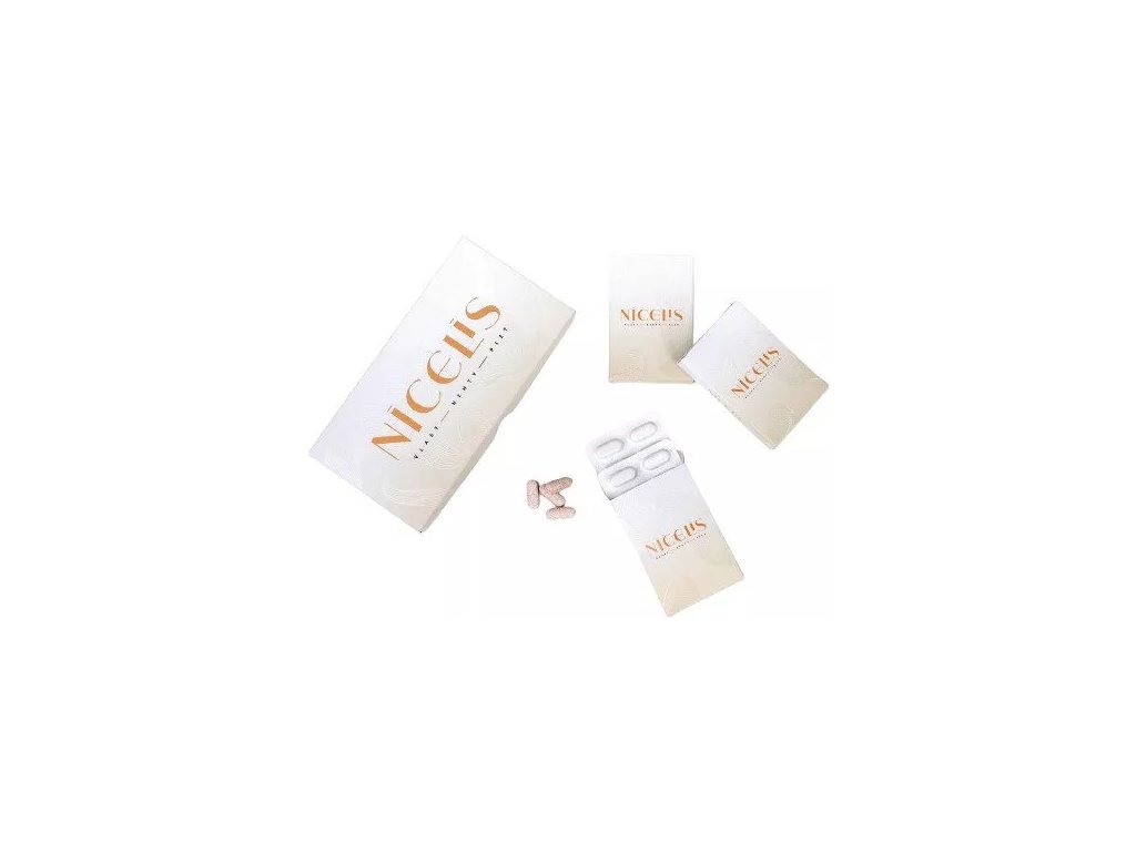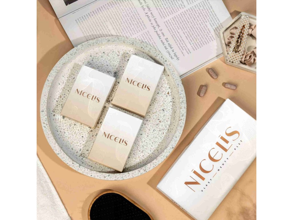 Zářivé vlasy, pevné nehty a krásná pleť. Doplněk stravy Nicelis obsahuje 23 aktivních látek - například dva druhy kolagenu, bylinné extrakty + vitaminy a minerální látky potřebné pro zdraví vlasů, nehtů (selen, zinek) a pokožky (vitamin A, biotin, zinek).