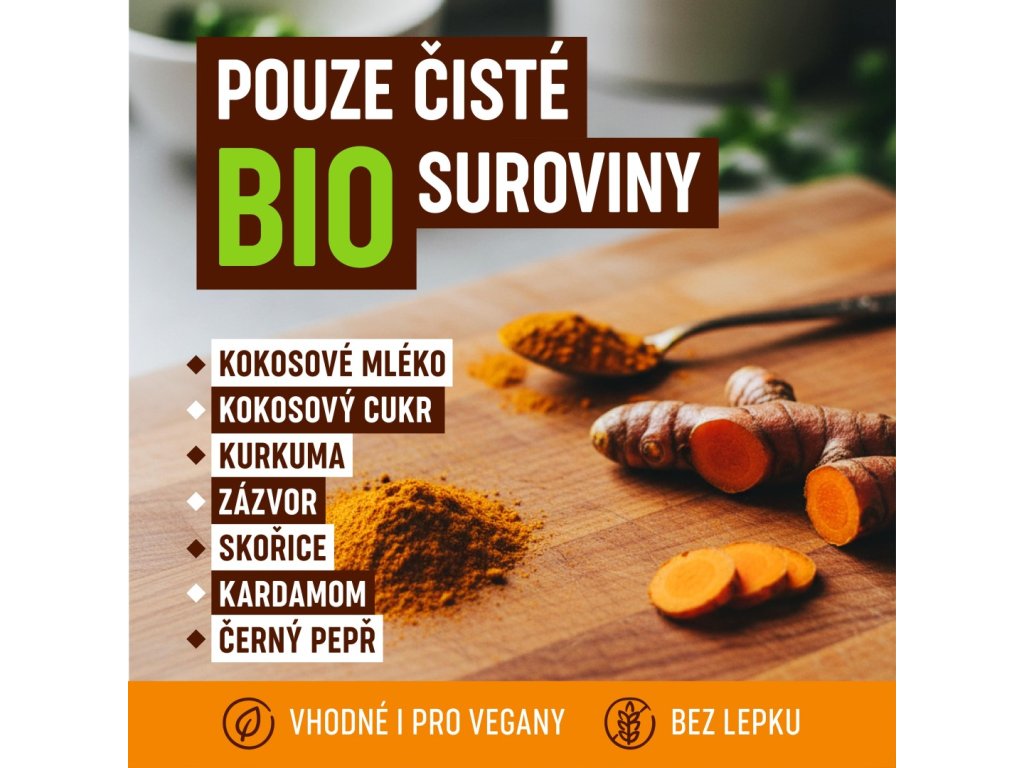 Kokosové mléko* 66 % (kokosová dužina*, maltodextrin*), kokosový cukr*, kurkuma* mletá, skořice* mletá, zázvor* mletý, kardamom* mletý, černý pepř* mletý.
