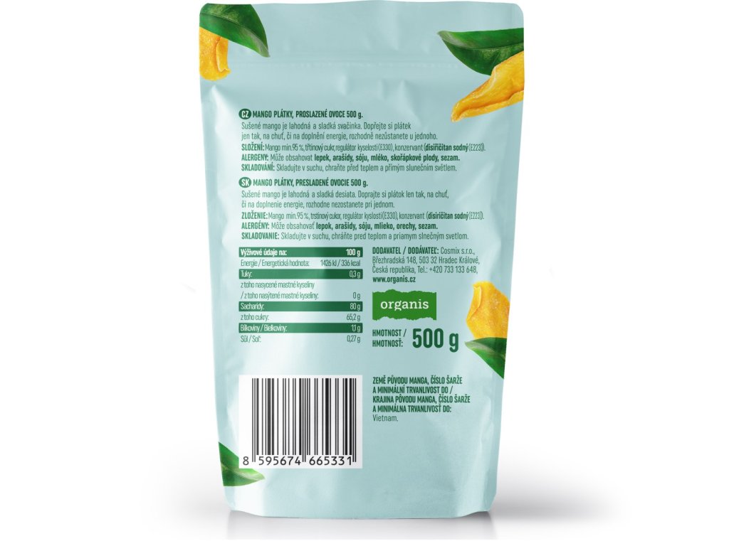 Mango min 95%, třtinový cukr, regulátor kyselosti (E330), konzervant (disiřičitan sodný (E223)).