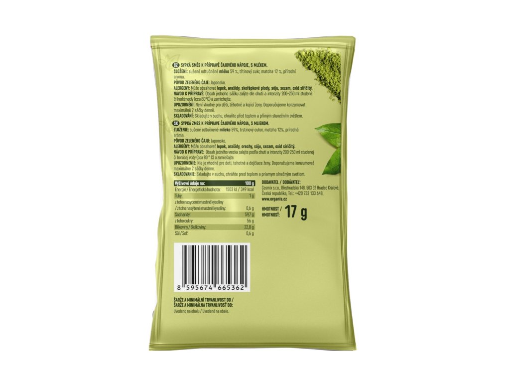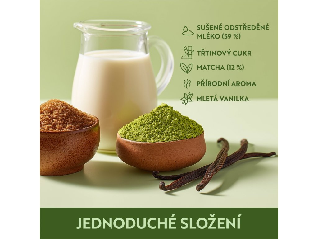 Sušené odtučněné mléko 59 %, třtinový cukr, matcha 12 %, přírodní aroma, mletá vanilka.
