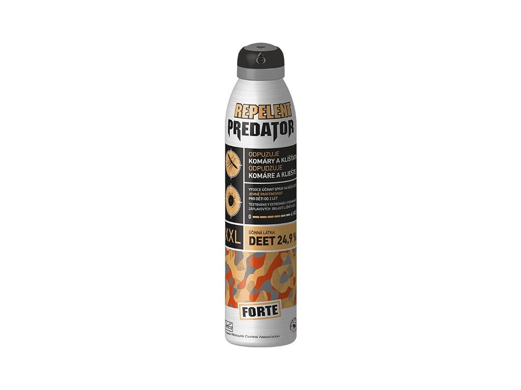Predator Repelent FORTE! Sprej odpuzuje komáry, klíšťata a jiný nepříjemný bodavý hmyz. Zvýšený obsah účinných látek (DEET 24,9 %) působí 4-6 hodin. Vysoká koncentrace účinných látek Vás ochrání a umožní Vám bezpečný a příjemný pohyb a pobyt v přírodě. Tento výrobek je určen pro dlouhodobou ochranu spojenou s vysokou fyzickou zátěží v oblastech s vysokým výskytem hmyzu. Laboratorně a terénně testováno Státním zdravotním ústavem Praha. Testováno v extrémních podmínkách záplavových oblastí lužních lesů, určeno proti komárům, klíšťatům, ovádům a ostatnímu bodavému hmyzu.