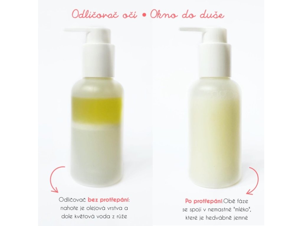 Díky použitým olejům (zejména cennému olivovému squalanu) odličovač nezanechává mastný film, naopak je po jeho použití oční okolí hedvádbě jemné a vyživené Složení bez vody, která je nejlevnější kosmetickou surovinou. Místo ní jsme v odličovači použili bio květovou vodu z růže, která je vhodná i pro citlivé okolí očí Používání je požitek díky hodnotným surovinám jakým je olivový squalan, hydratační kyselina hyaluronová (ve dvou velikostech), vzácný olej z granátového jablka nebo melounových semínek Po protřepání se z dvoufázového produktu stane nemastné "mléko", které má ale stále tekutou konzistenci pro velmi snadné použití - to je navíc ještě zpříjemněno pumpičkou, díky které lze odličovač dávkovat přesně a bez zbytečného plýtvání Vhodný pro vegany – 100% rostlinné složení Složení: Rosa Damascena Flower Water (květová voda z růže damašské), Squalane (nemastná látka získávaná z olivového oleje), Vitis Vinifera Oil (olej z hroznových jader), Polyglyceryl-10 Laurate (rostlinná mycí a pečující složka), Punica Granatum Seed Oil (olej z granátového jablka), Citrullus Lanatus Seed Oil (olej z melounových semínek), Aqua (voda), Sodium Hyaluronate (kyselina hyaluronová ve dvou velikostech), Glycerin, Helianthus Annuus Seed Oil (slunečnicový olej), Tocopherol (vitamin E), Polyglyceryl-6 Caprylate, Polyglyceryl-3 Cocoate, Polyglyceryl-4 Caprate, Polyglyceryl-6 Ricinoleate (rostlinné mycí látky), Sodium Levulinate (rostlinná antimikrobiální látka), Sodium Anisate (rostlinná pečující a antimikrobiální látka), Sodium Phytate (přírodní antioxidant), Lactic Acid (veganská kyselina mléčná), Citric Acid (kyselina citronová), Alcohol (0,001 % alkoholu), Citronellol, Geraniol (vonné složky přirozeně obsažené v použité růžové vodě) Použití: Před každým použitím lahvičku dokonale protřepejte. Odličovač je pak možné aplikovat dvěma způsoby: (ani v jednom případě není nutné přípravek oplachovat) 1. Navlhčete tampon a vyždímejte důkladně všechnu vodu (tak, aby z něj nic nekapalo). Pak na něj nanesete přibližně dvě pumpičky odličovače a tamponek opět lehce vyždímejte. 2. Odličovač (2 až 3 pumpičky) lze nanést také rovnou na suchý tampon.