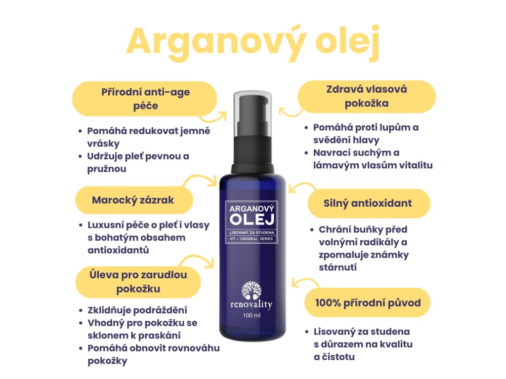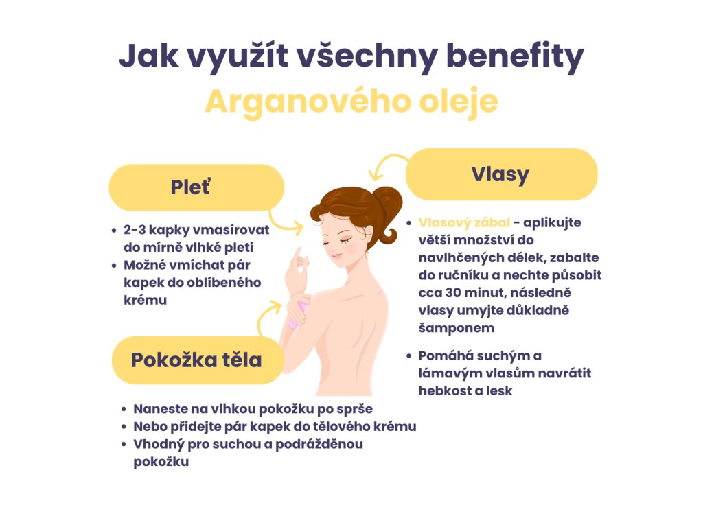 Arganový olej má výjimečné vlastnosti v kosmetice. Patří k luxusním olejům. Je zdrojem nenasycených mastných kyselin, antioxidantů, vitamínů a fytosterolů. Arganový olej působí blahodárně na pokožku zarudlou, vysušenou i se sklonem k praskání. Redukuje vrásky, hydratuje a pomáhá udržet pokožce svěží vzhled.