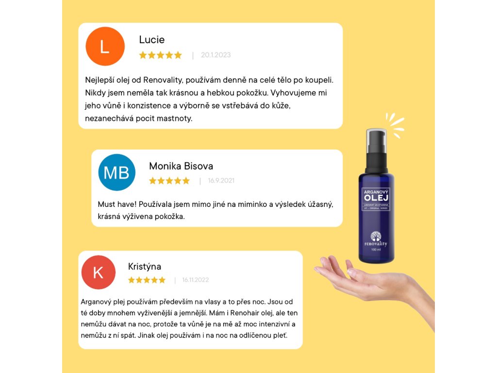 Motto značky Renovality: Rostlinné oleje jsou jako rostlinné zlato. K balení olejů používáme to nejlepší fialové sklo. Fialové sklo = perfektní obal pro vynikající výrobky. Fialové sklo zaručuje bioaktivní stálost našich výrobků. Vliv světla vždy urychluje proces molekulární rozpad přírodních produktů. Fialové sklo funguje jako přirozený filtr, který chrání a zlepšuje kvalitu olejů. Více o balení olejů Renovality do lahviček Miron Violet se dočtete v článku: Fialové sklo = perfektní obal pro vynikající výrobky. Oleje Renovality mají čistý přírodní původ. Jsou lisovány za studena pouze z pečlivě vybraných rostlin, což zaručuje také jejich perfektní kvalitu. Obsahují nejvyšší možné množství bioaktivních látek. Oleje se výborně se vstřebávají. Oleje značky Renovality neobsahují žádné minerální oleje, syntetické látky, konzervanty nebo barviva.