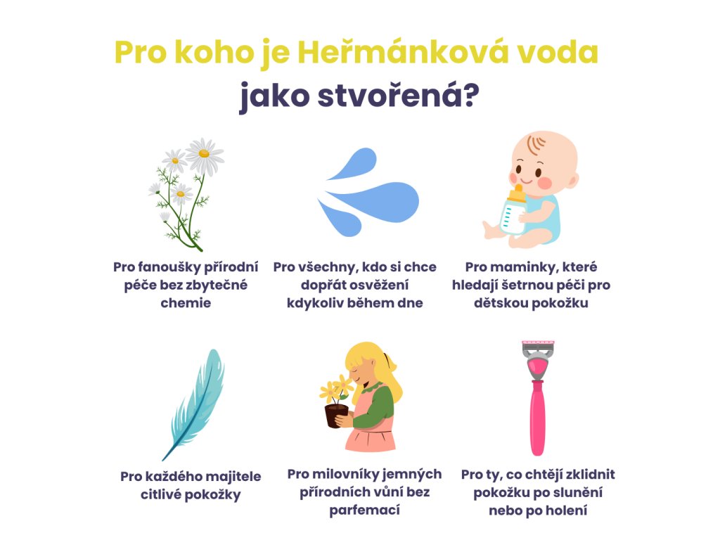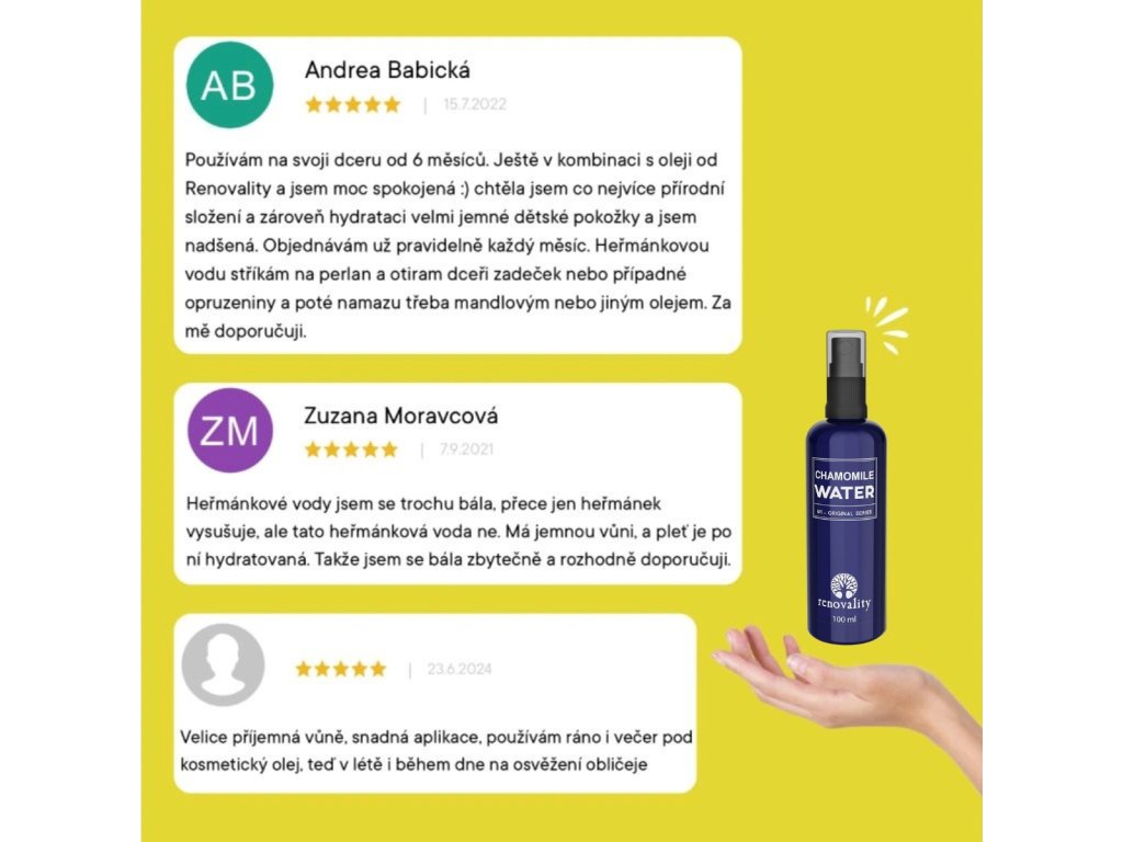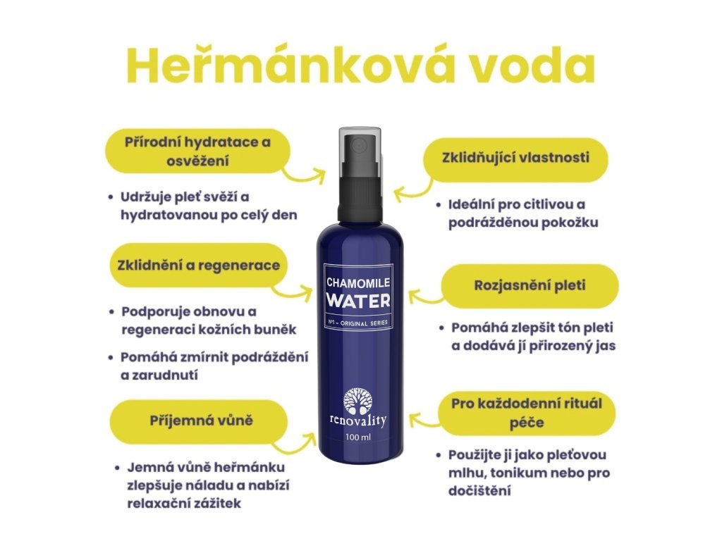 Heřmánková voda je vhodná pro každodenní použití, při odličování a čištění pleti. Poskytne příjemné osvěžení během dne.