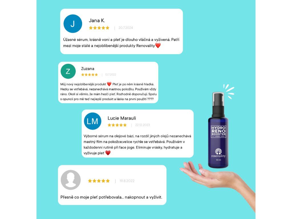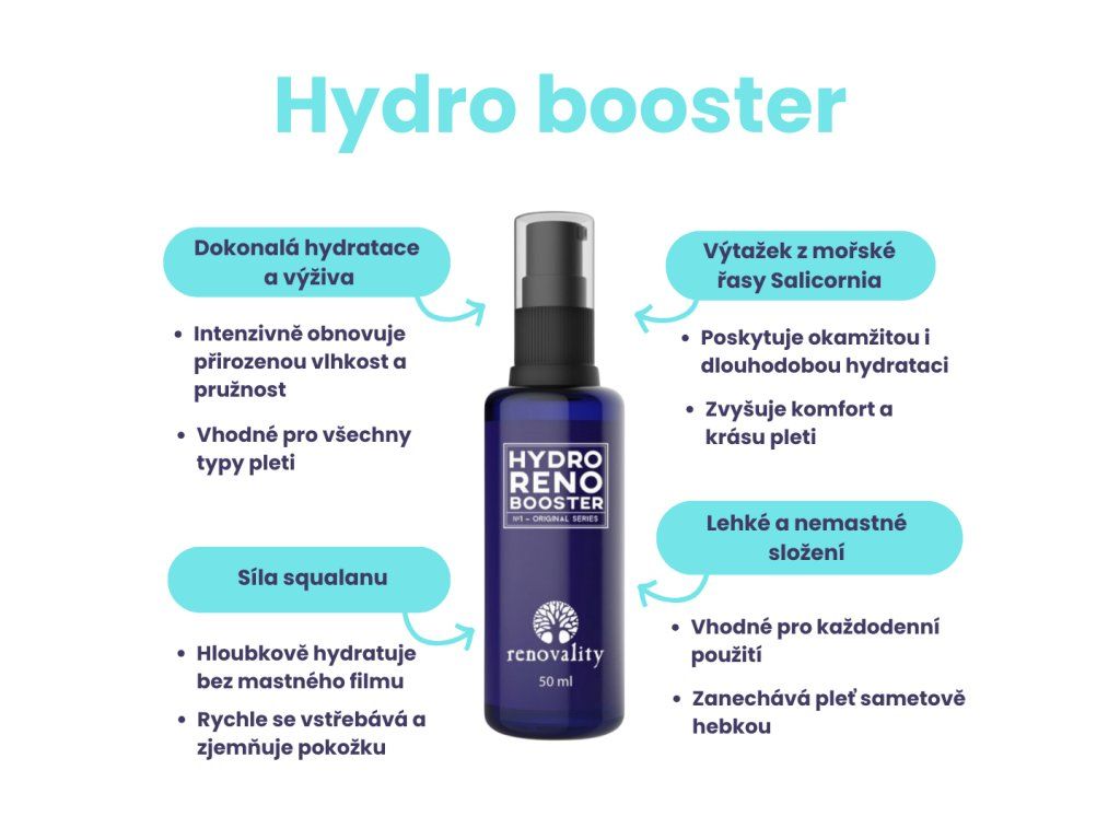 💦 Zažijte hydrataci nové generace s Hydro Renoboosterem! 💦 Hydro Renobooster je vaším klíčem k dokonale hydratované, svěží a zářivé pleti. Jeho lehká, nemastná textura se okamžitě vstřebává a poskytuje pleti maximální komfort bez zatížení. Skvalan, známý svými vynikajícími hydratačními schopnostmi, obnovuje přirozenou vlhkost pokožky, zatímco výtažek z mořské řasy Salicornia zajišťuje okamžitou i dlouhodobou hydrataci. Dopřejte své pleti pocit pružnosti, hebkosti a zdravého jasu každý den – s Hydro Renoboosterem posunete svou každodenní péči o pleť na zcela novou úroveň! Objevte sílu dokonale hydratované pleti – s Hydro Renoboosterem! 🌟