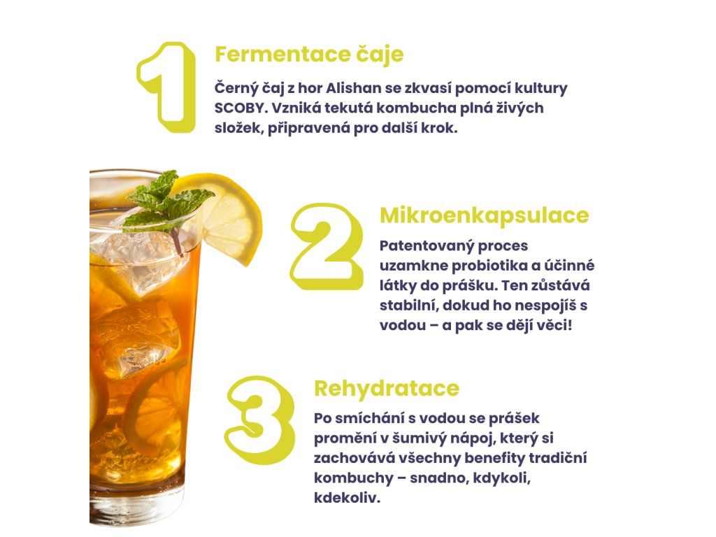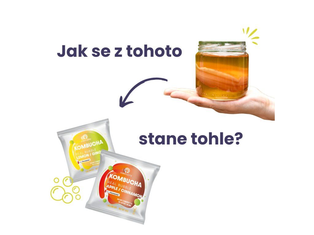 Kombucha Real Bubble Lemon/Ginger 🍋 Objevte revoluční způsob, jak si vychutnat osvěžující kombuchu kdekoliv a kdykoliv. Zažijte šumivou explozi chuti a prospěšných látek bez zbytečného čekání nebo tahání se s balenou kombuchou. Naše je jednoduše instantní se zachováním všech benefitů, které kombucha může nabídnout. A ještě něco víc! V každé dávce najdete miliardu probiotik, prebiotickou vlákninu a neodolatelnou harmonii citrónu a zázvoru, která zahřeje na duši a osvěží tělo. Stačí zalít studenou vodou a vaše denní pitná rutina je na světě!