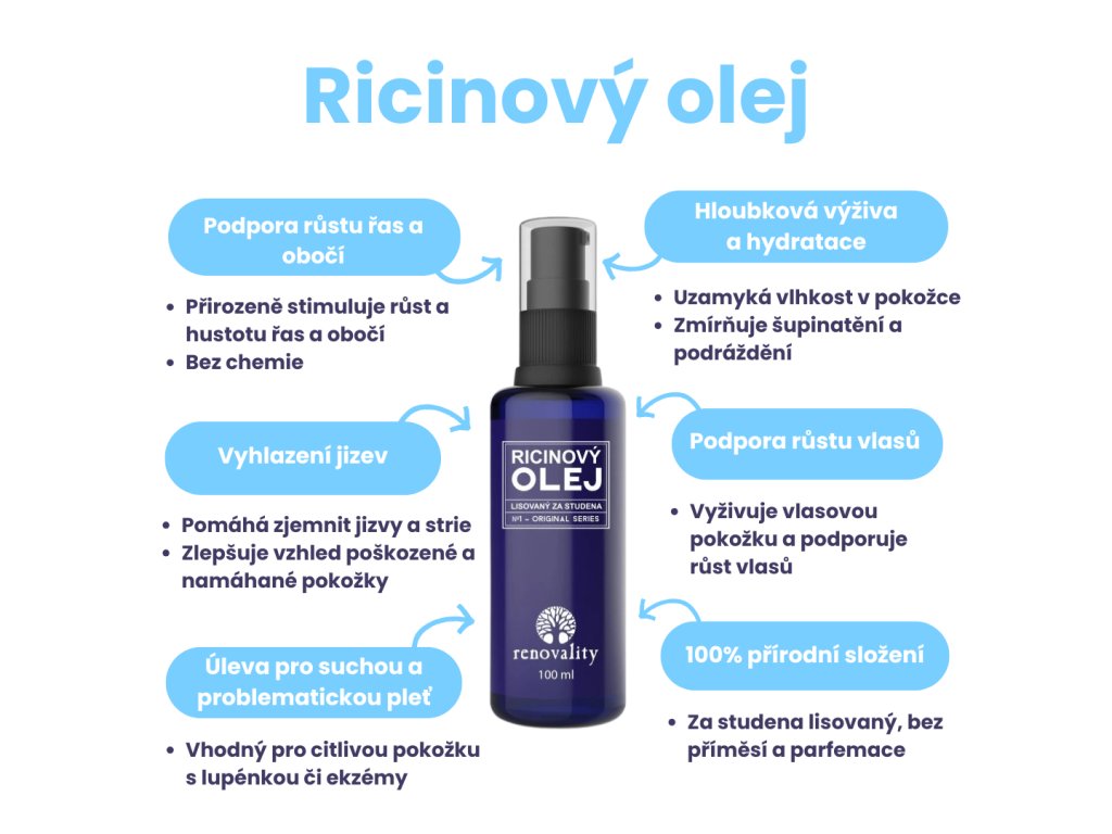 Ricinový olej je ideální na suchou pokožku, neboť ji regeneruje a zvláčňuje.