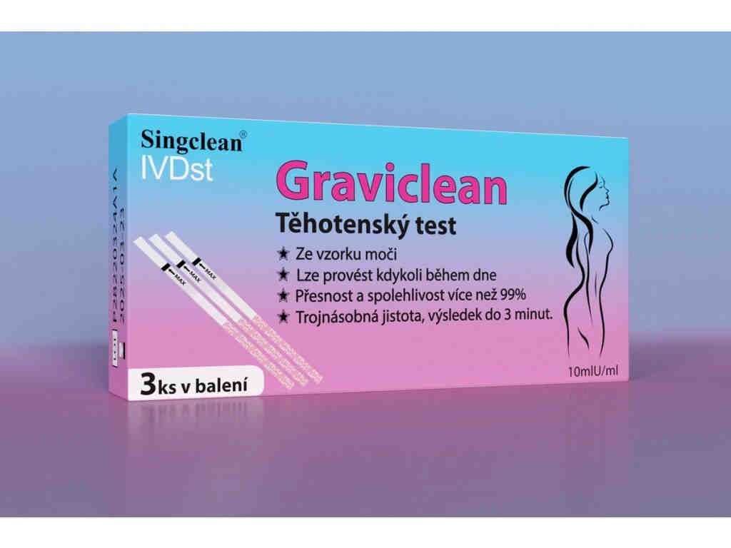 Graviclean je rychlý těhotenský test, který zjišťuje přítomnost lidského choriového gonadotropinu (hCG). Ten se objevuje v moči již ve velmi časném období těhotenství, testování je vhodné již od prvního dne vynechané menstruace. Test je určen pro sebetestování v nádobce s močí (in vitro). Vysoká citlivost testu (10 mlU/ml) zajišťuje přesný a spolehlivý výsledek již za 3 minuty.