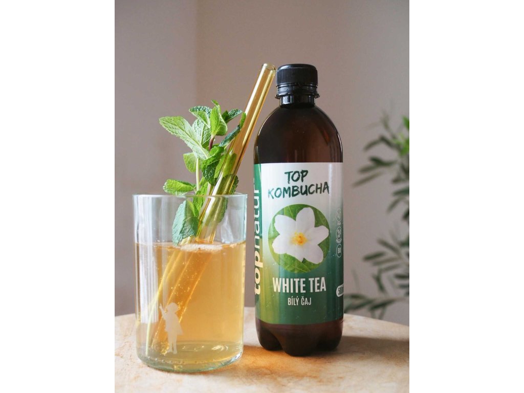 Voda z plzeňského kraje, výluh z BIO bílého čaje (92 %), BIO třtinový cukr, kultury kombuchy (kvasinky a bakterie mléčného kvašení).