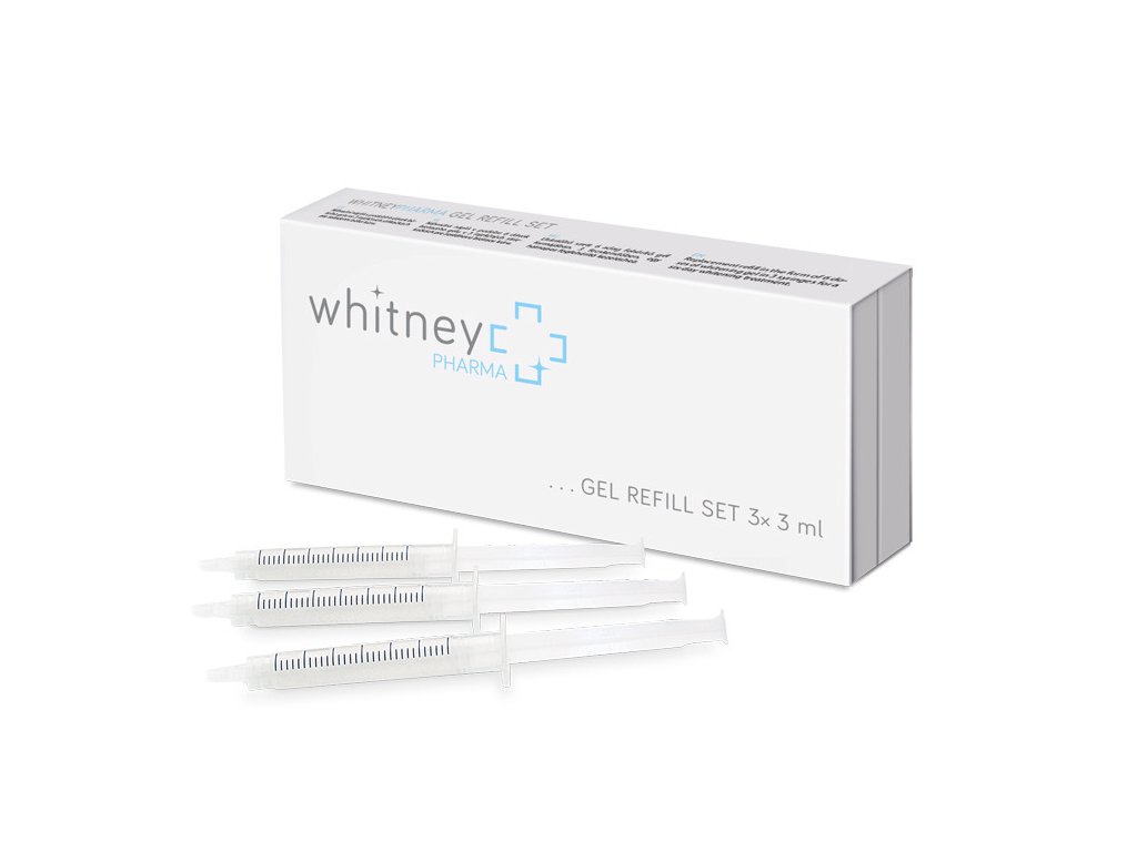 WhitneyPharma refill set je náhradní náplň k bělicí sadě na zuby WhitneyPHARMA, která působí na bázi bělicího gelu aktivovaného UV zářením. UV světlem dochází k oxidaci složek gelu, likvidaci nečistot a bakterií, které způsobují žloutnutí zubů. 6 denní kúra vám zajistí maximální bělící účinek a výsledek srovnatelný s péčí profesionálního dentisty.