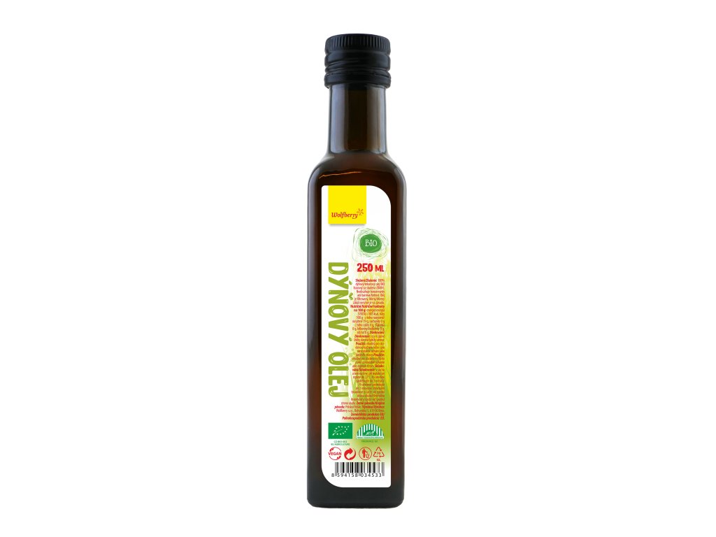 Dýňový olej se získává lisováním perfektně dozrálých tmavozelených dýňových semen, která se následně suší na slunci. Olej má tmavě zelenou barvu s podtónem do hněda, jedinečnou vůní a chuť, která by se dala přirovnat k oříškům. Dýňová semínka jsou používaná jako močopudný a protizánětlivý přírodní prostředek jak u mužů, tak u žen. Podporují imunitní systém, zpomalují stárnutí a bojují proti osteoporóze u mužů.Wolfberry dýňový olej se získává lisováním za studena s následnou filtrací. Díky této tradiční technologii si zachovává více než 80 % nenasycených mastných kyselin a maximální množství dalších látek, které by byly rafinací zničeny.