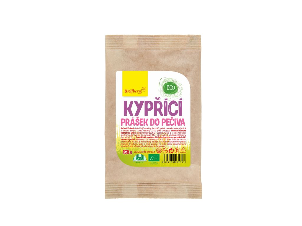 Kypřící prášek do pečiva z vinného kamene BIO 150 g Wolfberry je bezlepková a bezfosfátová příměs, používaná úplně stejně jako běžný kypřící prášek ke zvětšení objemu a odlehčení textury pečiva. BIO kukuřičný škrob je obohacen vinným kamenem a doplněn běžnou jedlou sodou.