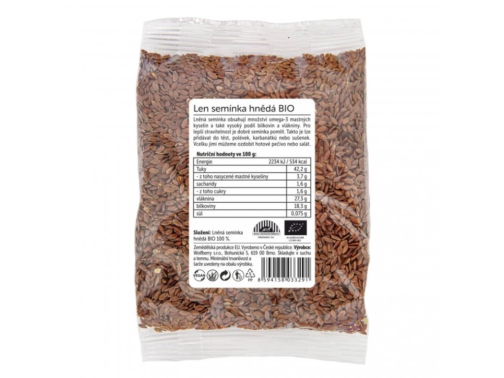 Lněné semínko hnědé Wolfberry BIO 200 g je vynikajícím zdrojem nenasycených mastných kyselin, vitamínů, minerálů, vlákniny a ligninů. V BIO kvalitě, bez GMO, z kontrolovaného ekologického zemědělství.
