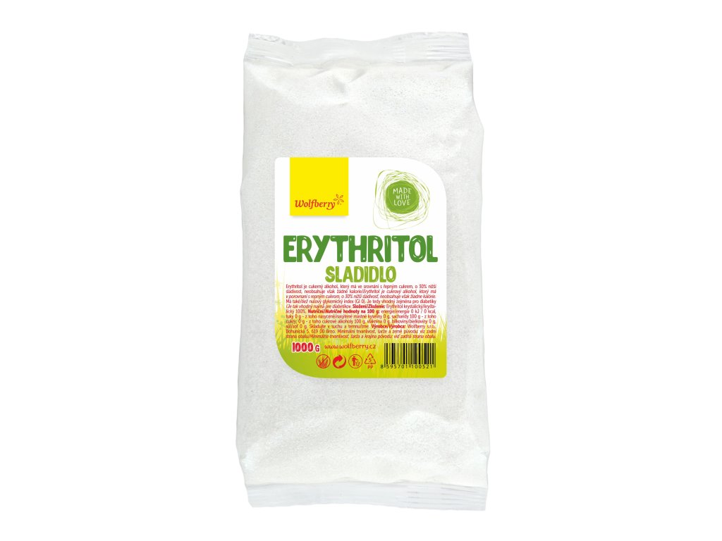 Erythritol 350 g Wolfberry je cukerný alkohol, který se vyskytuje přirozeně v některých druzích ovoce. Erythritol má nulový glykemický index (GI 0). Je tedy vhodný zejména pro diabetiky.