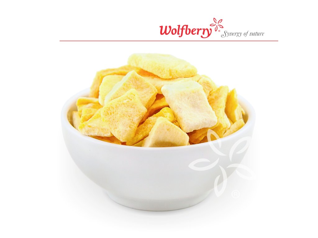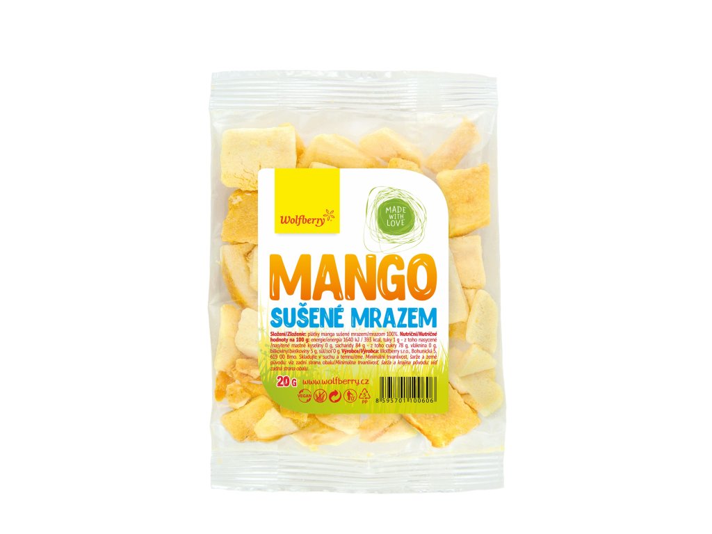 Mango je bohatým zdrojem betakarotenu, vitamínu C a vitaminu A. Jedinečný postup zpracování lyofilizací zachovává ovoci jeho plnohodnotnou chuť, barvu i aroma. Sušené ovoce tím nepřichází o své vitamíny, minerály a další živiny obsažené v čerstvém ovoci. Lyofilizace je proces vysušení a odstranění vody ze suroviny za extrémně nízké teploty a tlaku. Výsledkem je surovina, která je vzhledově velmi podobná té čerstvé, avšak má mnohem nižší hmotnost a dokonale křupavou konzistenci. Z nutričního hlediska je mango zajímavé vysokým obsahem draslíku, vitamínu E a některými vitamíny skupiny B, konkrétně B1, B2, B6 a niacin. Mrazem sušené ovoce je snadno skladovatelné, trvanlivé a lze jej částečně rehydratovat pomocí vody do téměř původního stavu. Pokud si u sušeného manga všimnete bílých skvrnek, nic se neděje. Jde o to, že ovoce často zcukernatí a to se projeví právě takto.