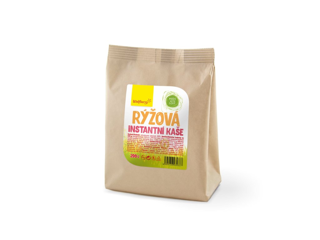 Rýžová kaše 200g Wolfberry. Instantní neochucená rýžová kaše, lehce stravitelná, rychle a snadno připravená, vyrobena z přirozeně bezlepkových surovin.